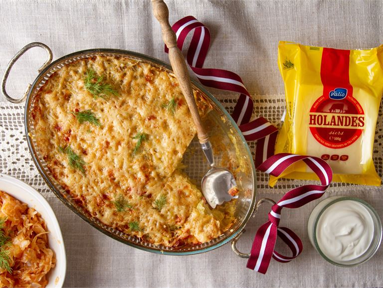 Latvijas svētkos kārojas ko latviski vienkāršu un tādu, ko saukt par Latvijas garšu? Kartupeļi! Protams! Cauraudzītis, siers, krējums - tas viss kopā rada latvisko noskaņu. Svētku mielastam klāt var pasniegt desiņas, štovētus kāpostus, marinētus gurķīšus un tomātus.