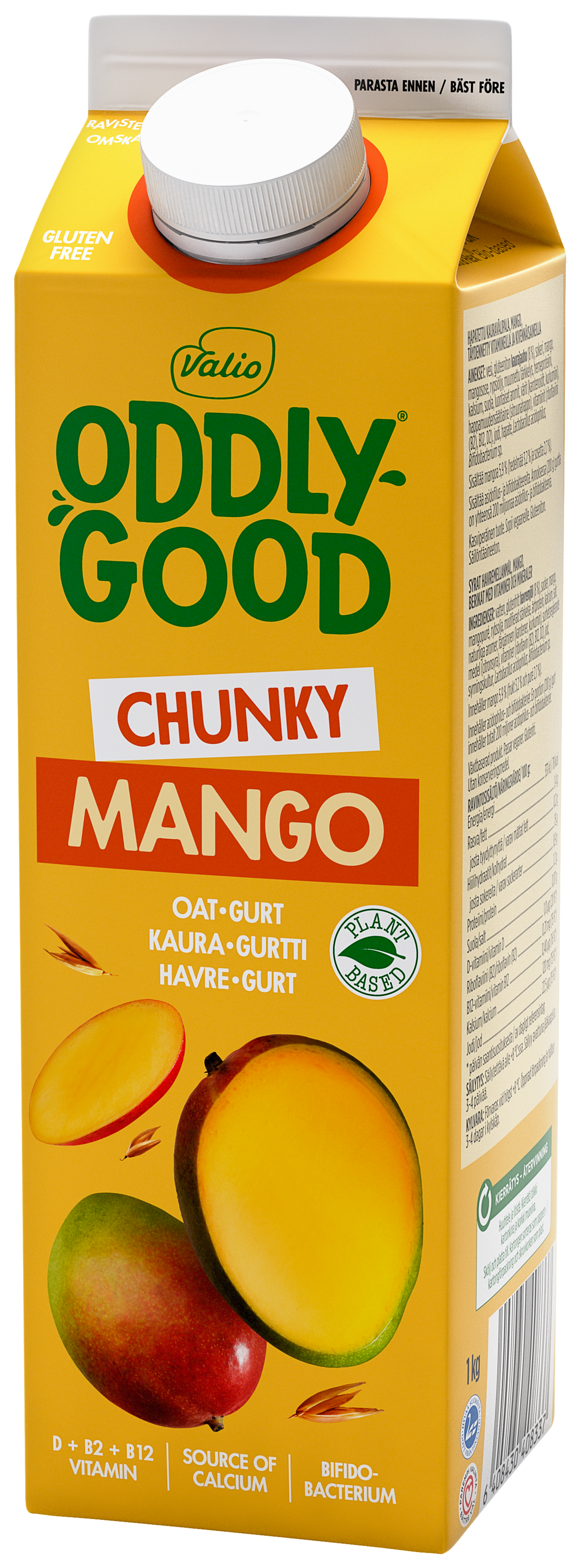 Вода, безглютеновая овсяная мука 8%, сахар, манго, пюре манго, рапсовое масло, модифицированный крахмал, гороховый белок, кальций, соль, натуральные ароматизаторы, красители (каротин, куркумин), регулятор кислотности (лимонная кислота), витамины (рибофлавин (В2), В12, D2), йод, закваска, Lactobacillus acidophilus, Bifidobacterium sp. Содержит манго 5,9% (фрукты 3,2% и пюре 2,7%).
